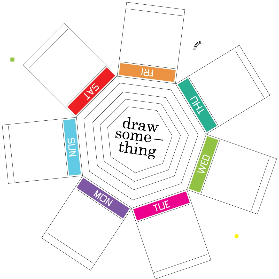 D / R / A / W _ S / O / M / E / T / H / I / N / G _ < click+download > Have you ever kept a diary on a 7–sided polygon before? Didn't think so. Let's do this! Trim this odd–shaped form and hang with a pin or magnet in the center_ With each passing day of the week add a quick drawing of something that happens, big or small. Don't try and make the thing perfect >> the wonkier, the better. Add a line of text below each image if you desire and try filling the inner lines of the heptagon with text as well_ Your week is pretty much my fave new graphic novel_
